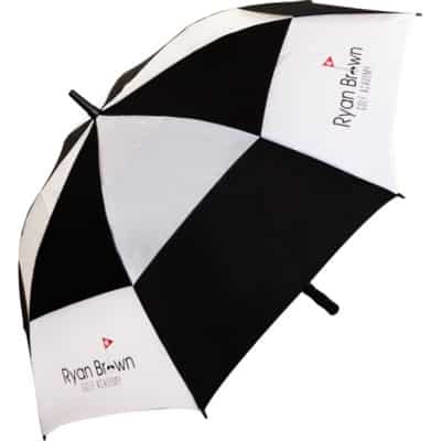 Very strong, vented umbrella. 14mm?fibreglass stem with automatic opening mechanism, 75cm stormproof fibreglass ribs, 133cm open diameter vented?canopy, black eva handle with decal recess, colour co-ordinated sleeve. Available in black & white, black, dark green & white, dark green, navy blue & white, nave blue, red & white, red, royal blue & white, royal blue. Dye sublimation print available.