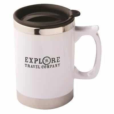 Bianco is a ceramic effect travel mug in white and silver with a popular ‘jam jar’ shape and flip lid.