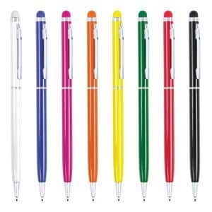 Slim twist action aluminium metal ballpen with stylus. Solid colour barrel and silver chrome effect. Includes stylus colour matched to the barrel. Available in white, blue, red, green, yellow, orange, pink and blue.