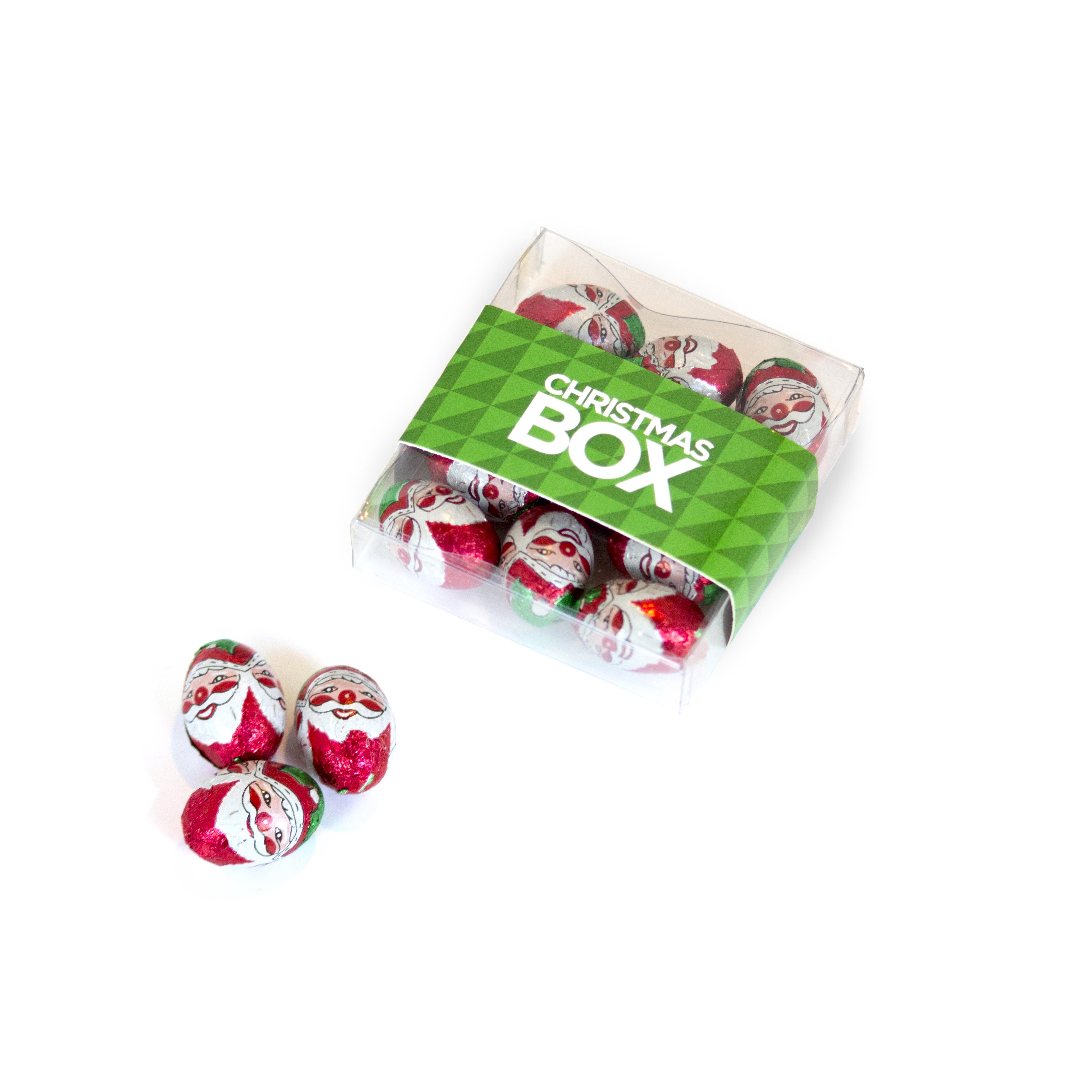 Foiled Father Christmas Santa Chocolate Balls in Acetate Box. Printed Full Colour. Weight: 55g. Minimum Quantity: 100.