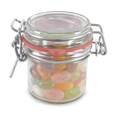 Clip top glass jar with rubber seal. Filled with various fillings. Price based on jellybeans. Fillings: boiled sweets, mint pillows, chalk torpedos, liquorice allsorts, wine gums, fruit’sweets, jellybeans, gum balls, tum tums. MOQ 250