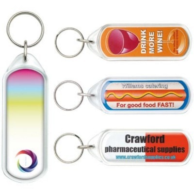 Stylish Plastic Keyring with Slim Line Lozenge Shape. Encapsulated Insert Printed Insert’shows Branding to Both Sides. Made in Britain. minimum Quantity: 250. /span>