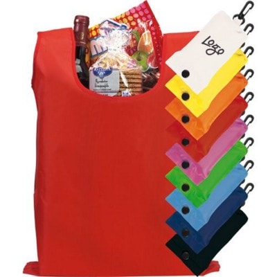 Folding Shopper Tote Bag Made of 190 T Polyester. Pouch with Popper & Carabiner Hook. Measures Unfolded: 53x38cm. Available in White, Yellow, Light Blue, Dark Blue, Orange, Red, Purple, Green, Black. Minimum Quantity: 300.