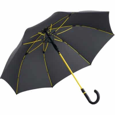 Stylish midsize umbrella with colored shaft and ribs, elegant round soft-touch handle with doming option further color accents and, comfortable automatic function for a quick opening, equipped with high-quality windproof system for maximum frame flexibility in stormy conditions. Available black, black & yellow, black & red, black & lime green, black & white (colour interchange is the metal frame/shaft and ribs of the umbrella, not the panels)