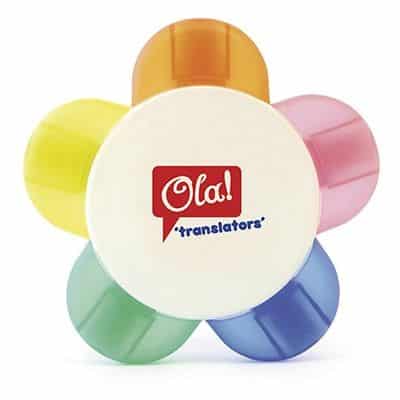 5 highlighter petals. Yellow, orange, green, pink and blue.
