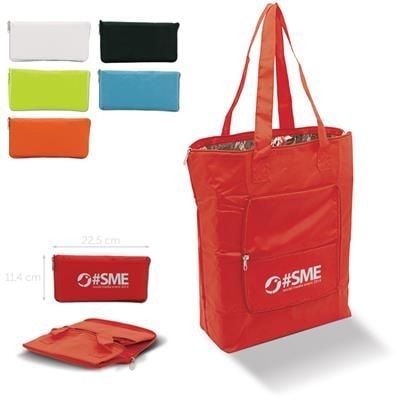 Folding Portable Cool Bag. Bag Can be Folded into Small Pouch. Zipper Closure. Additional Compartment on Side. 210d. Available in Black, Light Blue, Pale Green, Orange, Red, White. Minimum Quantity: 50.