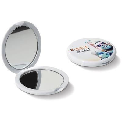 Flat Mirror with 2 Mirrors on Inside. 1 Normal & 1 Magnifier Mirror. Easy to Take with You. Digital Imprint Possible. Minimum Quantity: 300.