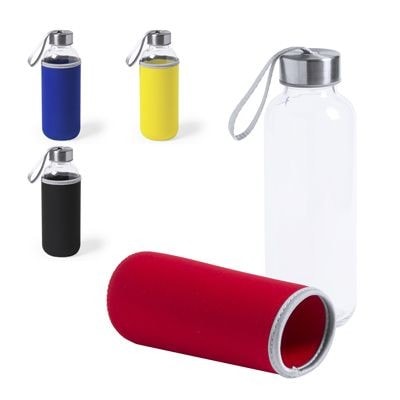Glass 450ml Drink Bottle with Screw Cap Closure & Built in Wrist’strap. Included is Wine Bottle Cooler. Individually Boxed. Available in Black, Red, Yellow, Blue. Minimum Quantity: 50.