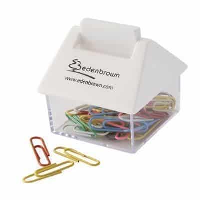 House shaped container for paperclips. Transparent and white. Coloured paperclips included.