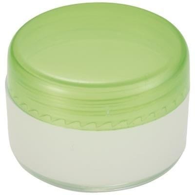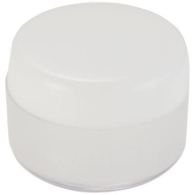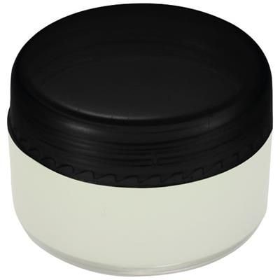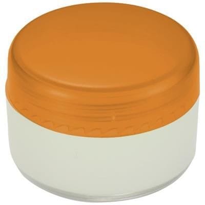 Vanilla Flavoured Lip Gloss in Round Container with Screw on Lid. Polypropylene. Available in white, black, orange and blue. Minimum Quantity: 500.
