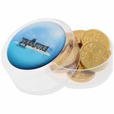 Foil wrapped chocolate gold or silver coins in tub. Full colour digital printed personalisation.