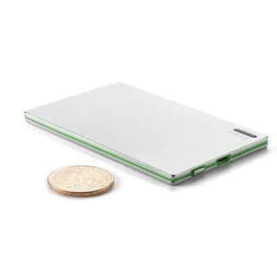 Slim credit card size powerbank. Available in aluminium or stainless steel. 2000 MAH capacity. Aluminium metal colour – black/ gold/blue. Stainless steel colour – brished silver/Blue or brished silver/red.