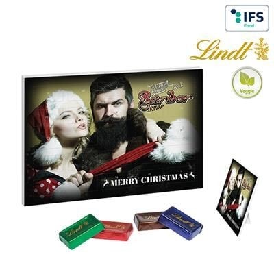 Filled with 24 Lindt Chocolate Rectangles, Total 120g. Made Out of FSC Carton. Horizontal Format. Place on Wall or Table. Individually Brandable on Front & Back. Suitable for Vegetarians Minimum Quantity: 250.