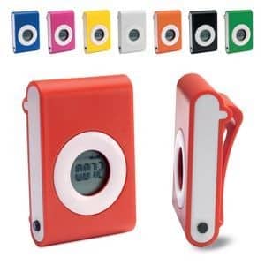 Counts steps, distance covered, calories burned. Belt clip. Available in white, black, red, blue, pink, yellow and green