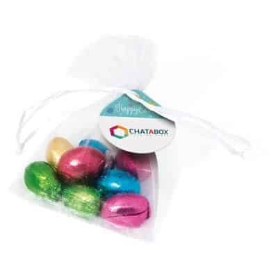 Filled with foil wrapped chocolate mini eggs. Branded with a double sided tag.