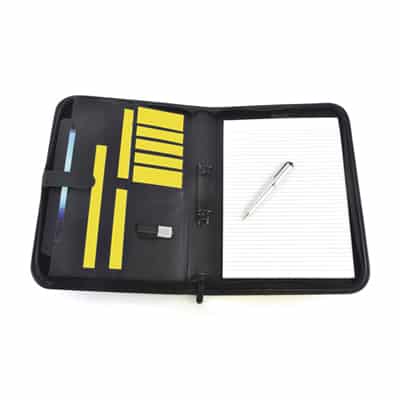 Oversized A4 PU Zipped ring bound folder. Includes calculater, tablet holder, document holder, business card holder and 25 sheet notepad.