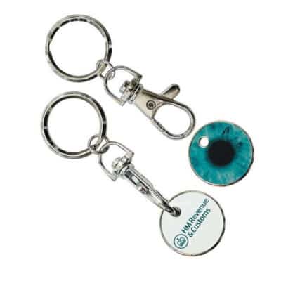 New Issue 1 Pound or Euro Coin – Can be printed on 1 or 2 sides. Supplied with spring clip and split ring attachment options. Pantone match colours. Choice of nickel or brass plating. 2-3 week lead time. UK Stock available for 1 week turnaround but prices are higher.
