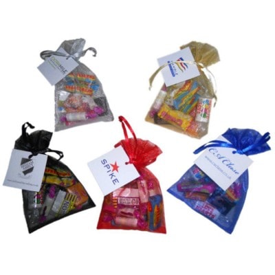 70g Selection of Retro Sweets in Organza Bag Available in Gold, Silver, Red and Black – 4 Colour Digital Printed Swing Tag Included. MOQ 50