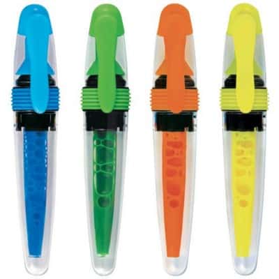 Individual liquid filled highlighter pen with transluscent body. Available in orange, yellow, blue and green.