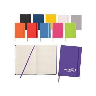 Soft Feel A4 Note Book with Cream Colour Lined Pages, Ribbon Page Marker & Elasticated Closure. Available in Silver, Ivory, Yellow, Blue, Light Blue, Orange, Red, Pink, Lime Green, Purple, Black. Minimum Quantity: 100.