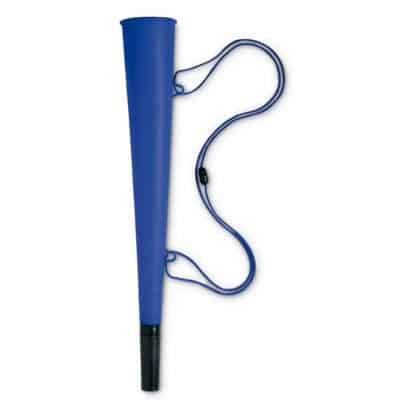 Stadium horn made from plastic with a cord. Available in red, white, orange and bliue.
