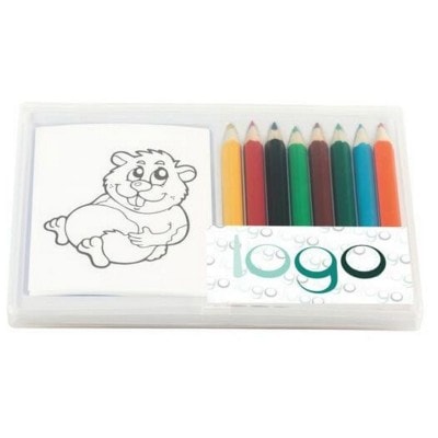 Eight Lacquered, Polished Crayons & Colouring Books with 12 Mini Colouring Pages, 6×2 Identical Images. Neatly Stowed in Handy Storage Case. Minimum Quantity: 200.